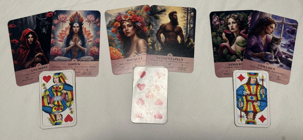 Die übergeordnete Energie der Woche, die noch nicht die Wochenlegung selbst darstellt, aber die über die ganze Woche wirkt, ist der Kreuz Bub, der Karo König und die Herz 7 verkehrt.
